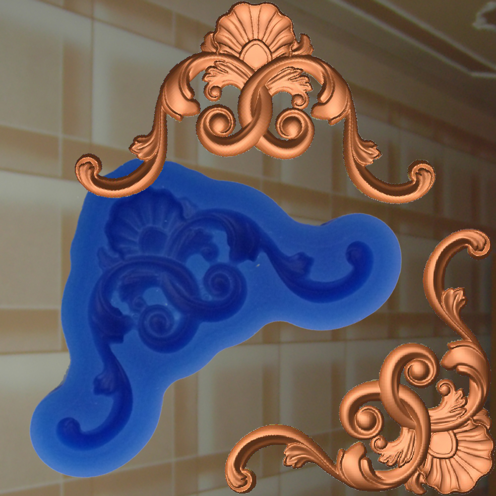 Die Silikonform „Muschel der Bewegung“ erzählt von barocker Leichtigkeit und innerer Dynamik. Aus einer zarten Muschelform erhebt sich ein Spiel aus Voluten, das sich nicht starr verhält, sondern fließt – wie eine ornamentale Welle, die sanft aus der Ecke herauswächst.