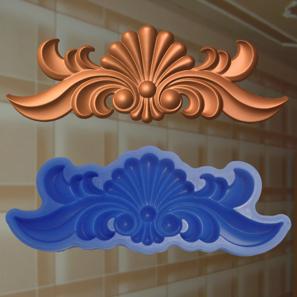 Dieses klassische Zierornament ist symmetrisch aufgebaut und wird von einer zentralen, fächerförmigen Muschel geprägt, die sich ruhig und ausgewogen nach oben öffnet. Von der Mitte aus entwickeln sich beidseitig sanft geschwungene Voluten, die dem Ornament eine fließende, harmonische Bewegung verleihen. Die runden Übergänge und gleichmäßigen Tiefen sorgen für eine plastische und hochwertige Anmutung.