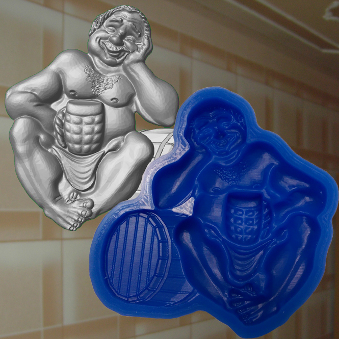 Diese Silikonform zeigt eine ausdrucksstarke Figur in einem Moment stiller Zufriedenheit: sitzend, den Kopf in die Hand gestützt, ein breites Lächeln im Gesicht – als hätte die Zeit für einen Augenblick angehalten. Neben ihm das Fass, vor ihm der Becher, Sinnbilder für Genuss, Geselligkeit und das einfache Glück.