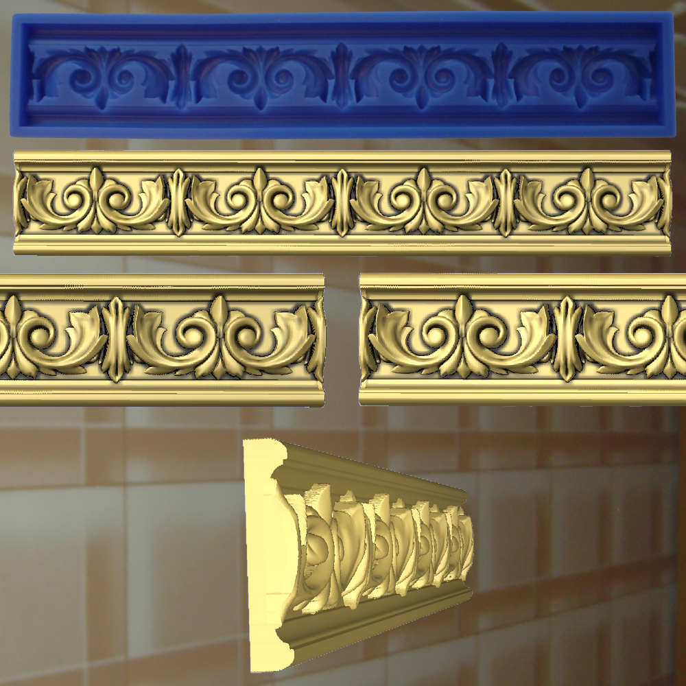Diese Silikonform dient zur Herstellung eines klassischen Zierprofils mit symmetrisch angeordnetem Palmettenornament und klar gegliedertem Linienverlauf. Die Negativform ermöglicht eine präzise Abformung der plastisch ausgearbeiteten Palmetten und sauber definierter Konturen über die gesamte Profillänge.